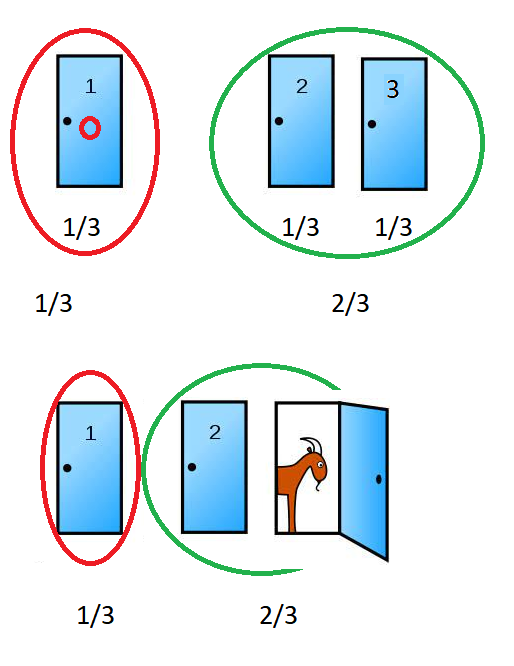 Posssiamo anche dire che dopo la scelta del concorrente il conduttore disegna un cerchio rosso attorno alla porta scelta ed un cerchio verde attorno alle altre due definendoli gruppo A (la porta scelta) e gruppo B (le altre due) e proponga al concorrente se vuole cambiare scelta con l'opportunità di poter aprire contemporaneamente le porte del gruppo B ( il cerchio verde)...ovvio che conviene..non so dov'è il premio e quindi poter aprire due porte è per me vantaggioso aumentando le possibilità al 66,66...%.