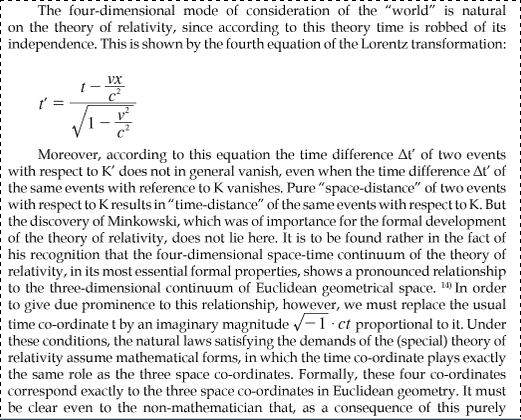 Lo chiedo perché il libro è "Relatività: Esposizione Divulgativa e scritti su Spazio Geometria Fisica", A. Einstein, parte 1 sezione 17 "Lo spazio quadridimensionale di Minkowski", e dato l'autore e l'argomento, è probabile che io abbia ancora qualche idea confusa.. Ho riscontrato che anche sulle versioni in inglese vi è la stessa definizione tale e quale.