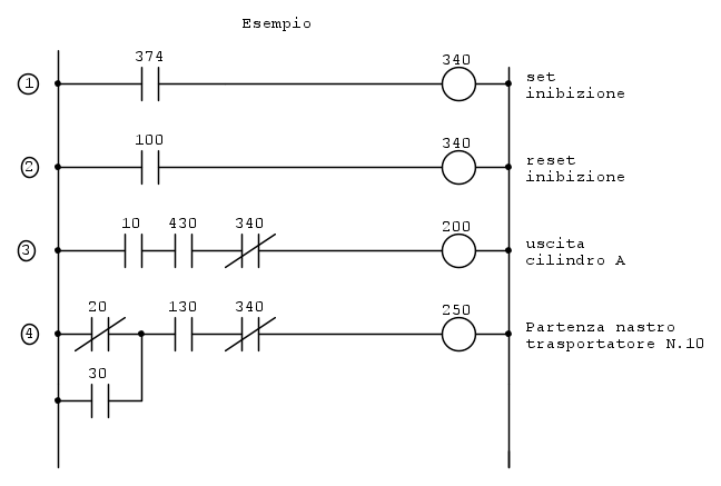 La logica sopra descritta vi da un’idea sul modo di inibire certe fasi di un ciclo. In questo esempio, quando ritorna l’alimentazione, il riferimento 374 sarà ON solo durante la prima scansione, eccitando il relè ritentivo 340. Il contatto NC del relè 340 è posto in serie ai consensi logici che abilitano le uscite 200 e 250. Quando le condizioni programmate saranno tali da comandare a ON le uscite 200 e 250, queste rimarranno diseccitate fino alla diseccitazione del relè 340. Il solo modo di diseccitare il relè 340 è di premere il pulsante di reset 100, permettendo quindi alle uscite 200 e 250 di essere eccitate.