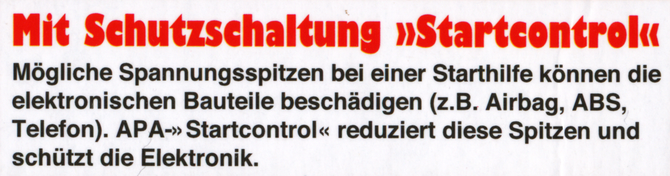 "Potenziali picchi in un salto iniziale possono danneggiare i componenti elettronici (ad esempio, airbag, ABS, telefono). APA Startcontrol riduce questi picchi e protegge l'elettronica".