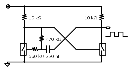 3) la resistenza da 470 kΩ, collegata all'uscita del primo NOT, carica lentamente il condensatore. Quando lo carica abbastanza da avvicinarsi alla soglia di commutazione (circa metà della tensione di alimentazione) all'ingresso del primo NOT, il primo NOT comincia a commutare la sua uscita. Quando questa uscita si è avvicinata abbastanza alla soglia di commutazione del secondo NOT, questo a sua volta comincia a commutare, variando il livello di tensione a un morsetto del condensatore. Questo fornisce una retroazione positiva, cioè se per esempio la tensione all'ingresso del primo NOT stava aumentando, la retroazione la fa aumentare ancor più. Questo accelera e rende decisa la transizione di stato all'uscita.