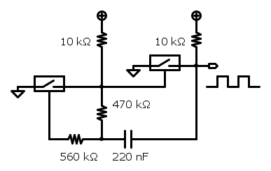 Qui il primo switch e' collegato con un capo a GND e con l'altro a VCC attraverso una resistenza di pull-up (per cui in uscita si ha 0 quando l'ingresso di comando e' ad 1 e viceversa), l'ingresso di comando e' collegato a GND attraverso un condensatore e all'uscita attraverso un'altra resistenza ... all'accensione il condensatore e' scarico, quindi lo switch e' aperto, per cui l'uscita e' a VCC e carica il condensatore attraverso le due resistenze (pullup piu retroazione), ad un certo punto la tensione sul condensatore diventera' sufficente a farlo chiudere, l'uscita andra' a GND e scarichera' il condensatore attraverso la resistenza di retroazione, finche' la tensione sul condensatore sara' abbastanza bassa da far riaprire lo switch, e cosi via.