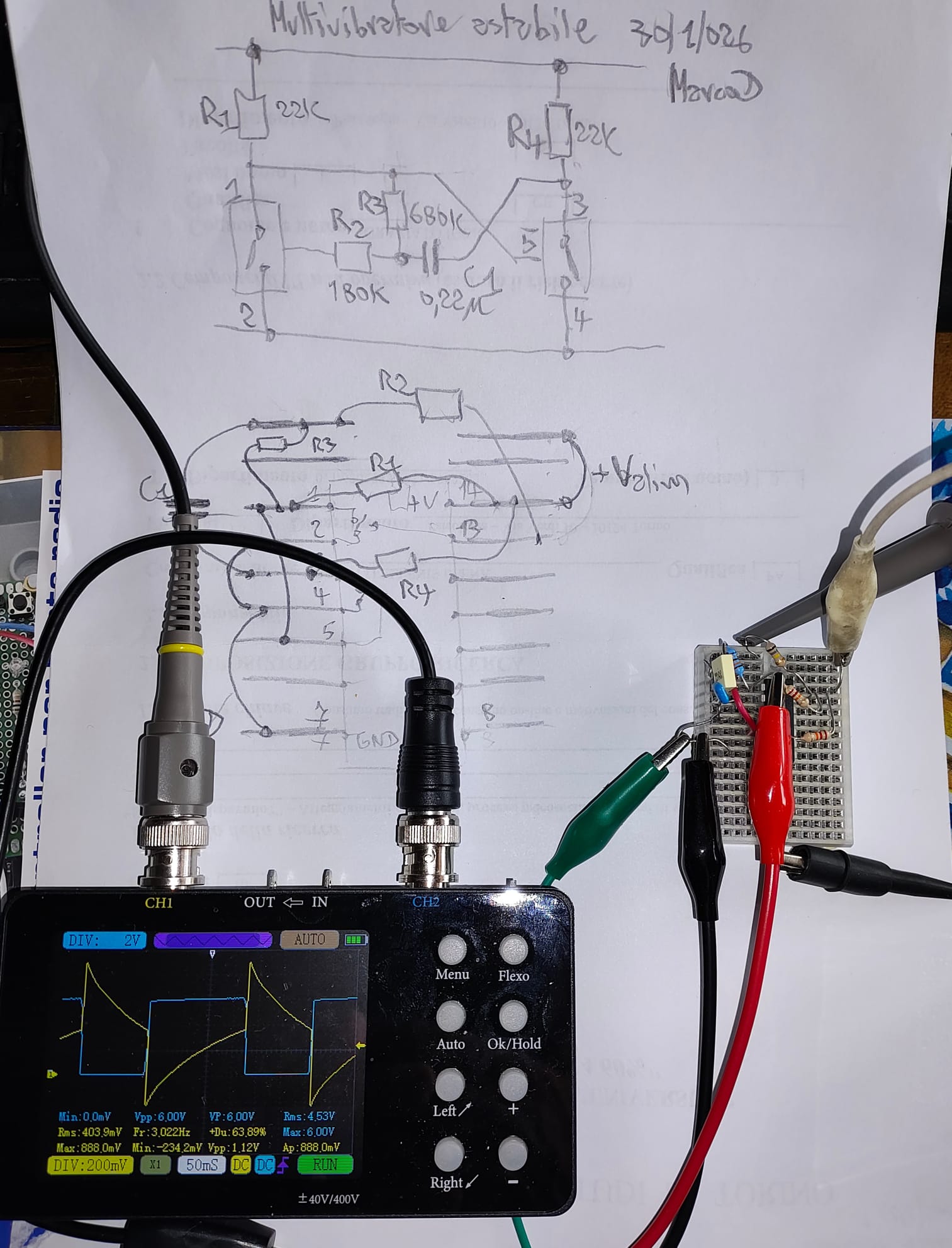 allego immagine con forma d'onda e lo schizzo manoscritto con schema elettrico e piano di montaggio. Mi rimane da capire come esattamente funziona e ricavare le equazioni degli esponenziali che definiscono la parte dinamica.