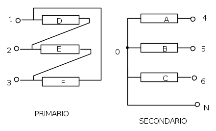 Nel disegno sono rappresentati il primario collegato a triangolo di un trasformatore ed il secondario con collegamento a stella con neutro.
