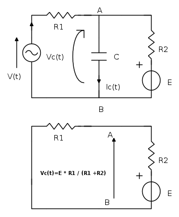 In cc considero il generatore di tensione un cto cto ma è il ruolo e il valore della tensione del condensatore che mi sfugge... Dopo 1 secondo, mi verrebbe da considerare (in cc) che Vc = E = 10. Invece no... svolgendo poi la parte pas mi deve risultare che il "contributo" in cc deve essere di soli 5V. Come mai?
