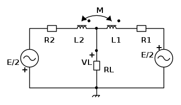 ![V_\text{L} =\frac{ R_\text{L}[R_2-R_1+\text{j}\omega(L_2-L_1)]E/2}{R_1R_2+R_1R_\text{L}+R_2R_\text{L}+\text{j}\omega[R_\text{L}(L_1+L_2+2M)+L_1R_2+L_2R_1]-\omega^2(L_1L_2-M^2)} V_\text{L} =\frac{ R_\text{L}[R_2-R_1+\text{j}\omega(L_2-L_1)]E/2}{R_1R_2+R_1R_\text{L}+R_2R_\text{L}+\text{j}\omega[R_\text{L}(L_1+L_2+2M)+L_1R_2+L_2R_1]-\omega^2(L_1L_2-M^2)}](/forum/latexrender/pictures/2ed85d9354e0b56fd54b77cb186e516d.png)
