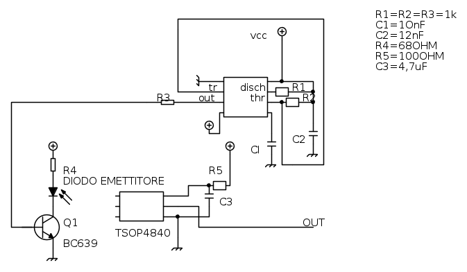 C2 collegato così si carica ad una tensione pari a Vcc e non si può più scaricare e quindi il diodo trasmettitore non dovrebbe lampeggiare... prova a cercare in rete astabile con 555, trovi tante informazioni e schemi applicativi con le formule per il dimensionamento. Se li monti bene il valore dei componenti mi sembra corretto per generare una frequenza di 40kHz con un duty cycle del 66% ...
