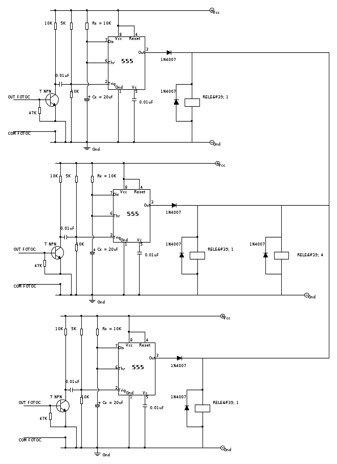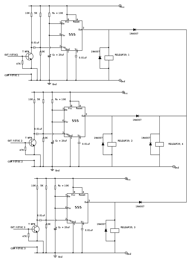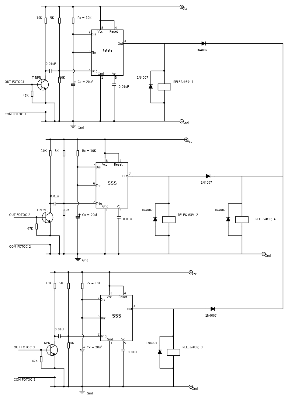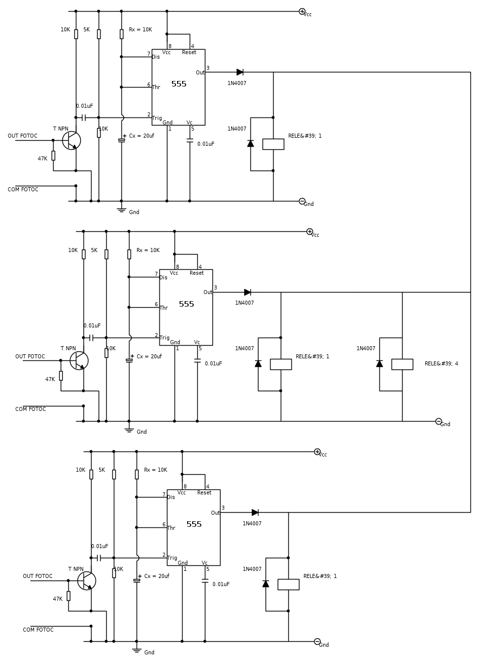 Il circuito prende come input un segnale "digitale" (una massa) per un tempo t (da 1ms a tot secondi) da delle fotocellule. Il segnale passa per il ne555 che ha il compito di allungare e "pulire" il segnale per un tempo ulteriore di 0,2 secondi e attiva quindi il relè corrispondente per il tempo t+0,2 secondi. In contemporanea attiva anche un altro relè che avrà quindi un uscita disaccoppiata dagli altri relè. Se voglio variare il tempo di allungamento basta modificare i valori di rx e cx.