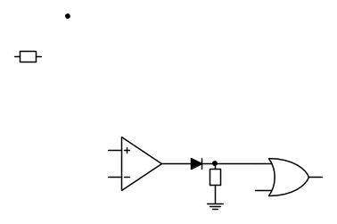 3) Toglierei resistenze e diodi all'ingresso della porta OR. Suppongo che la porta sia una porta CMOS, alimentata alla stessa tensione dell'operazionale, o no? Che porta OR pensavi di usare, di che famiglia logica?