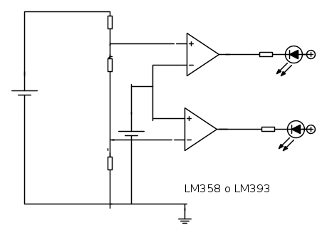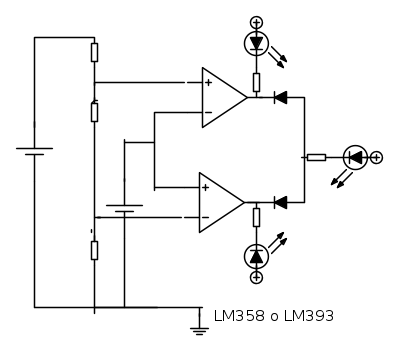 Infine sia con il 393 o il 358, due diodi e un po' di resistenze si puo` fare contemporaneamente la versione a due led E un led aggiuntivo che segnala livello troppo alto o troppo basso.