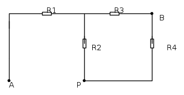 In questo modo R2-R4 sono in serie sul nodo P. La serie è in parallelo a R3. La resistenza di thevenin quindi è la serie di R1 e quel parallelo.