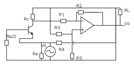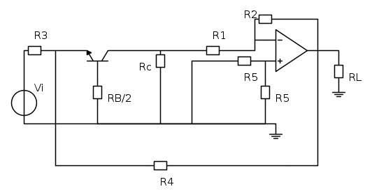 Dal precedente schema posso dire che la R3 è da considerare come una resistenza di sorgente e tale da non inserire nella rete di retroazione la quale è composta da R4. La retroazione di tipo PARALLELO-PARALLELO. So che le due R5 sono in parallelo ma per il momento non mi interessava semplificarle..Spero di non aver fatto grossi errori..