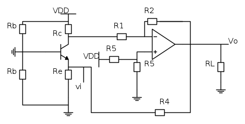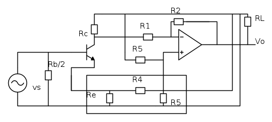 Allora provo ad analizzare il circuio brevemente. In questo esercizio ho un Base Comune a canale N e un Amp-OP Invertente in configurazione differenziale, cioè questo amplificatore amplifica la differenza degli ingressi. Come si può vedere ho già corto circuitato tutti i condesatori rispetto allo schema originale. Ora la mia domanda è la seguente.la retroazione, è giusto pensarla in questo modo, cioè introducendo R5?