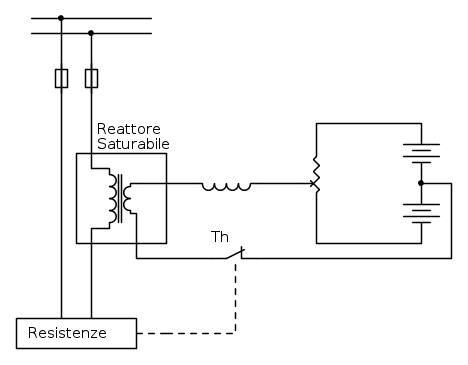 Regolando il segnale in corrente continua si regola l’uscita mediante la saturazione del nucleo. Questo è uno schema di principio di controllo temperatura mediante resistenze installate in una testata di un estrusore di polimero anni 65.