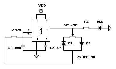 Non riesco a capire alcune cose, per esempio inizialmente il condensatore è scarico, questo determina un 1 logico al piedino 3 e allo stesso tempo il condensatore si carica, secondo un tempo pari a (pt1+470)*100nF. Nel momento in cui il condensatore raggiunge i 2/3 di Vcc l'uscita va a massa e il condensatore si scarica sulla 470, il che è molto veloce, quasi immediato, e subito si ripete la situazione di prima, cioè l'uscita va a livello logico alto.