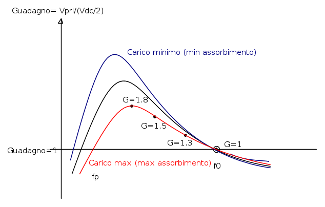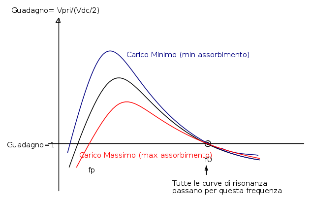 Una cosa IMPORTANTE che si vede è che tutte le curve, al variare del carico, passano per f0. E in questa frequenza, il guadagno è circa UNITARIO (il circa è perché non è proprio priprio cosi, ma comunque poco diverso).