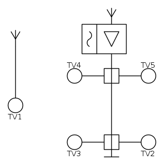 avevo una singola antenna da cui tramite cavi intrecciati portavo il segnale ,tutti uno dopo l'altra, in 5 punti tv in totale.