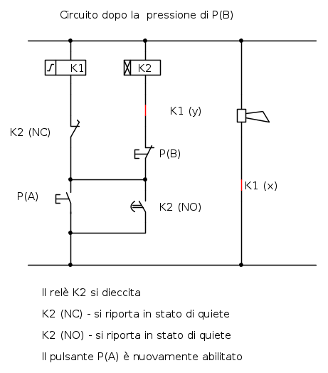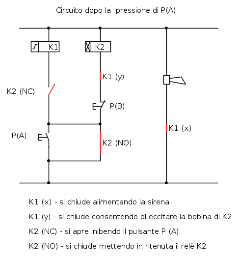 Il seguente schema illustra lo stato dei contatti successivamente alla pressione del pulsante P (A). In rosso sono evidenziati i contatti commutati.