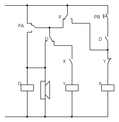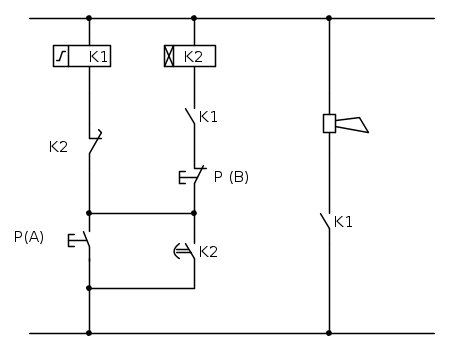 Secondo me funziona tutto fino alla seconda pressione sul pulsante A. Però a questo punto il relè K2 viene attratto di nuovo, e disabilita di nuovo il pulsante A. Per riportarsi alle condizioni iniziali è necessaria una ulteriore pressione sul pulsante B.