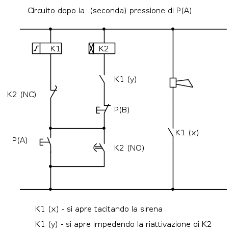 Resta da verificare che durante le transizioni (Fase 2 e Fase 3) durante la commutazione dei contatti di K2 (ritorno allo stato di quiete) non si venga ad avere un' attivazione involontaria del relè K1 che taciterebbe la sirena prima del "secondo" comando di P(A), ma penso di no.