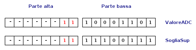 Le cose sono "leggermente" diverse, se il confronto lo fai su dati a 10 bit. Come hai giustamente notato, devi confrontare un dato su due byte. Un modo di procedere, in questo caso, potrebbe essere il seguente: se la parte alta di entrambi i dati (risultato e soglia) sono uguali, allora confronto la parte bassa come abbiamo indicato nel post [17].