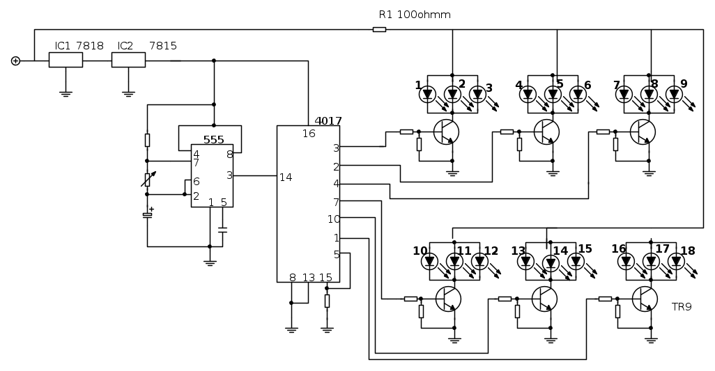 Da quello che ho capito (correggimi se sbaglio) tu invece vorresti che la sequenza fosse automatica (comandata da un 555) e pilotare un numero superiore di led.