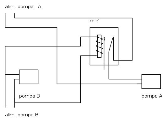 In condizioni normali (posizione del rele' come indicata e pompa B che non riceve tensione) funziona la pompa A. Quando la pompa B riceve tensione, si eccita la bobina rele' che stacca il contatto dell'alimentazione alla A.