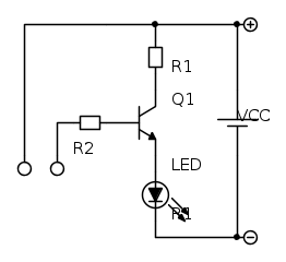 Ti posto di nuovo lo schema [22] corretto (versione con LED su emettitore) che avevo sbagliato e spostando R2 in una posizione migliore per la comprensibilità del circuito (come fatto da Pioz):