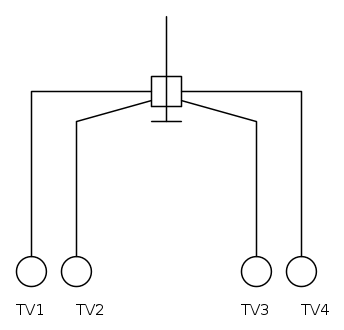nel punto (A) in cui il cavo proveniente dall'antenna centralizzata si congiunge con la presa passante, è collegato (in parallelo) un cavo che giunge poi ad un partitore a T (punto C) da cui a sua volta partono 2 cavi che collegano due tv ( TV1 e TV2); nel punto (B) in cui il cavo esce dalla presa passante per arrivare all'altra stanza, è collegato in parallelo un cavo che va diretto al TV3; nell'altra stanza originariamente era presente una presa terminale, che tempo fa è stata rimossa: pertanto il TV4 risulta collegato direttamente (nel punto F) al cavo uscente dalla presa passante.