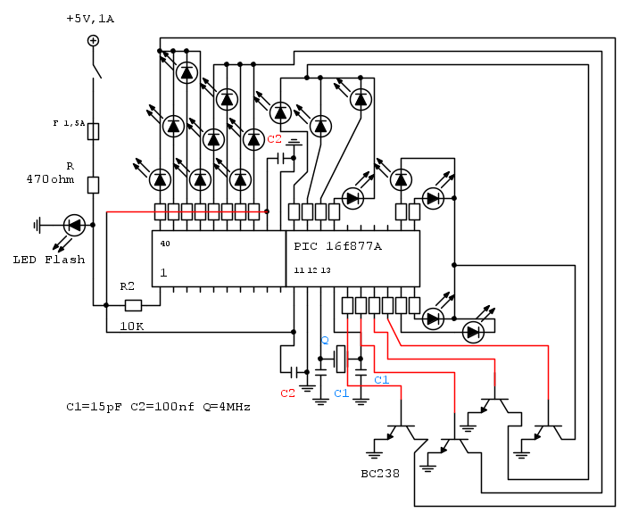 Le resistenze sono tutte da 470ohm tranne R2 tutti i led sono FLASH e i transistor sono tutti BC238