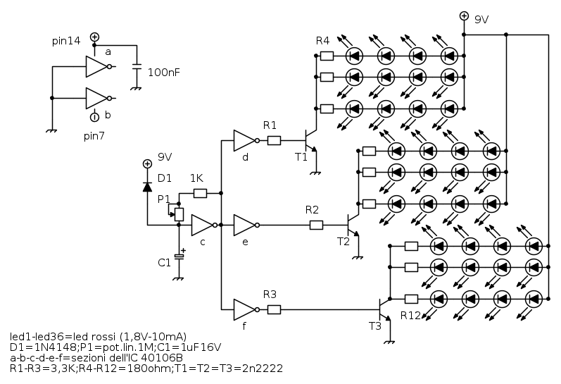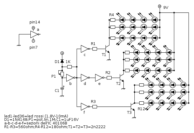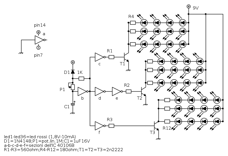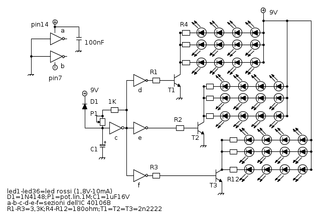 questa è la versione definitiva del circuito rivista e migliorata;noterai che il ramo centrale dei led ha 2 sezioni dell'IC(d-e),con cio avrai questo effetto:mentre i rami laterali sono spenti il ramo centrale è acceso e viceversa,un diversivo che rende piu attraente il dispositivo;tutti e 3 i rami lampeggeranno ovviamente alla stessa frequenza che tu puoi regolare a piacere con P1,un potenziometro da 1 megaohm col quale puoi avere un'ampia escursione nel campo del visibile: