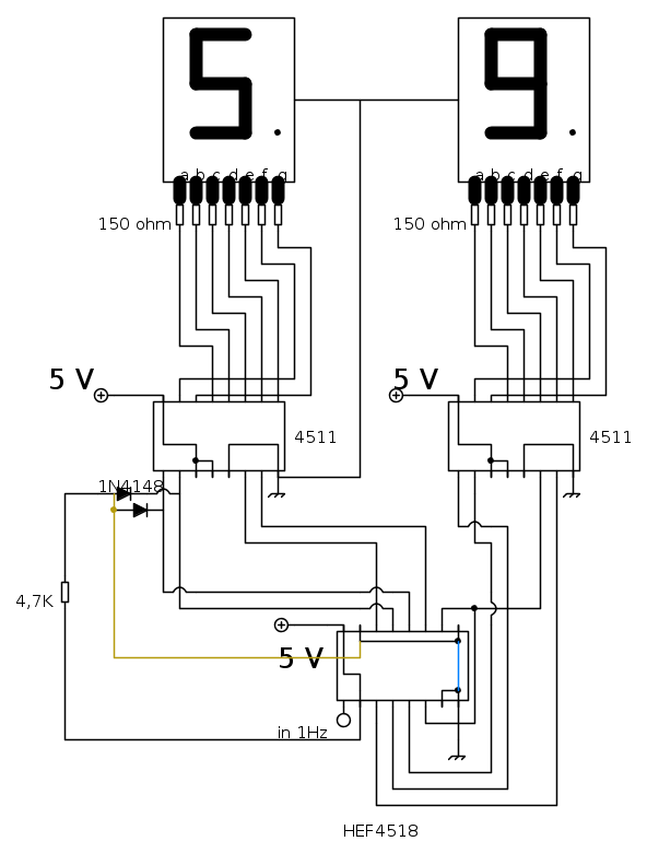 Hai sbagliato le connessioni del reset al sei; se colleghi i pin 7 e 15 a GND, il contatore non conta fino a 59 ma a 99. Quindi devi eliminare il collegamento in blu e connettere i diodi ai due pin di reset.
