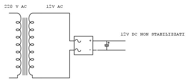 Lo schema che segue, è indicativo: il valore di C1 può variare un po' in base all'assorbimento, ma senz'altro dovrà avere una tensione di isolamento di almeno 35V, meglio se 50V: