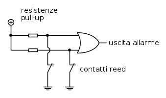 In questo modo se tutte le finestre sono chiuse l'uscita delle OR è 0, ma se una finestra dovesse venire aperta con il sistema in funzione, un ingresso della OR, venendo scollegato da massa verrebbe portato a 1, attivando lo stato di allarme.