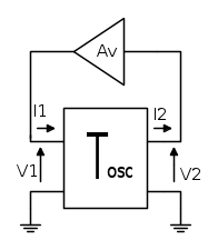 Un oscillatore autonomo quasi sinusoidale sarà sempre scomponibile in due parti, la prima delle quali composta da un amplificatore ideale e la seconda composta da una rete lineare, che risulterà conveniente esprimere tramite una matrice T, come si vedrà in seguito. Se l'amplificatore non è ideale i suoi parametri sono comunque inseribili all'interno della matrice T, che probabilmente diventerà risolubile con l'aiuto del calcolatore. In figura è riportato lo schema corrispondente.