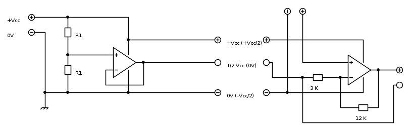 il primo punto (alimentazione duale di 5V quindi una singola di 10V) fornisce un'uscita di 6 V picco picco... insomma con 4 volt (quindi una duale di 2V) sei fortunato se esce qualcosa.