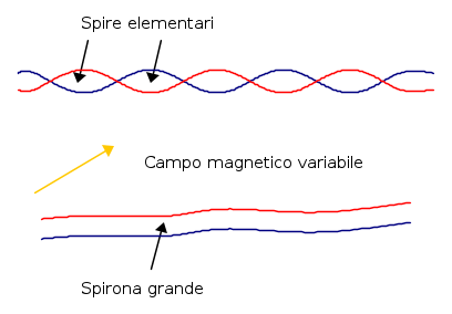 Nel caso twistato invece ci sono tante spire elementari. Se sommi l'area delle spire elementari viene un valore totale che e` piu` o meno come il caso non twistato, ma in questo caso ogni spira elementare e` collegata in opposizione di fase alla spira successiva: la tensione indotta su una spira viene cancellata da quella indotta sulla spira successiva, ammesso che le spire siano uguali e il campo disturbante uniforme.