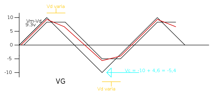 Quando la tensione sul condensatore varia, il condensatore è "agganciato" al generatore, cioè lo zener è in conduzione (nel modello meccanico la staffa del generatore è appoggiata ad una delle estremità della C e trasmette rigidamente il moto al pennino verde).
