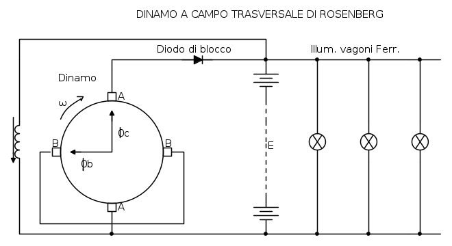 La Dinamo in questione fu ideata per utilizzarla per l’illuminazione delle vetture ferroviarie. La dinamo a campo trasversale fu studiata per essere atta a fornire energia elettrica a corrente in pratica costante, a polarità fissa, indipendente, entro certi limiti, dalla velocità variabile e dal senso d rotazione del rotore. In tal modo l’energia meccanica alla dinamo, poteva essere fornita mediante accoppiamento meccanico del suo rotore, a uno degli assi della vettura ferroviaria.