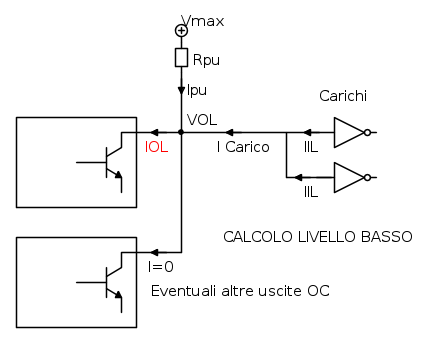 Il calcolo a livello basso lo si fa in queste condizioni: si assume che la tensione di alimentazione sia al valore massimo, che sull'uscita OC ci sia la tensione VOL definita dalla porta OC e che tutti i carichi riversino verso la porta la loro corrente IIL. In questo caso bisogna scegliere la resistenza di pull-up abbastanza grande da non superare con la corrente totale il valore di IOL della porta che sta attivando il livello basso. Anche se ce ne sono piu` in parallelo, si considera che solo una porta stia assorbendo corrente.