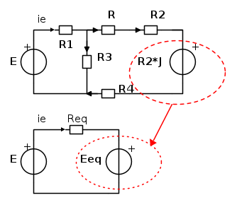 Ma non sono solo i resistori R, R2 e R4 a stare in serie? perché anche R3? La corrente che da R1 va in R e R3 non è diversa ?!? E poi nel passaggio in rosso perché hai fatto così? Io nell'ultimo circuito avrei messo non Eeq ma R2*J @_@