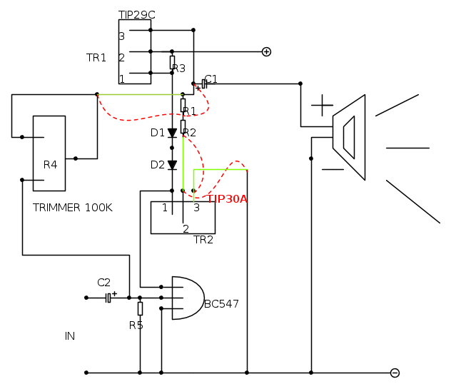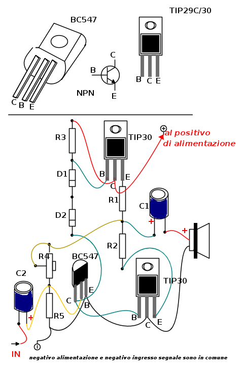 TR1/TR2: qualsiasi coppia di transistor complementari di media potenza (NPN/PNP): BC142/BC143 - BC441/BC461 - BCP54/BCP51 - BCX54/BCX51 - BD135/BD136 - TIP29/TIP30 - ZTX651/ZTX751 o equivalenti (scegliete quelli che trovate al miglior prezzo) [ usati TIP29C/TIP30A ]