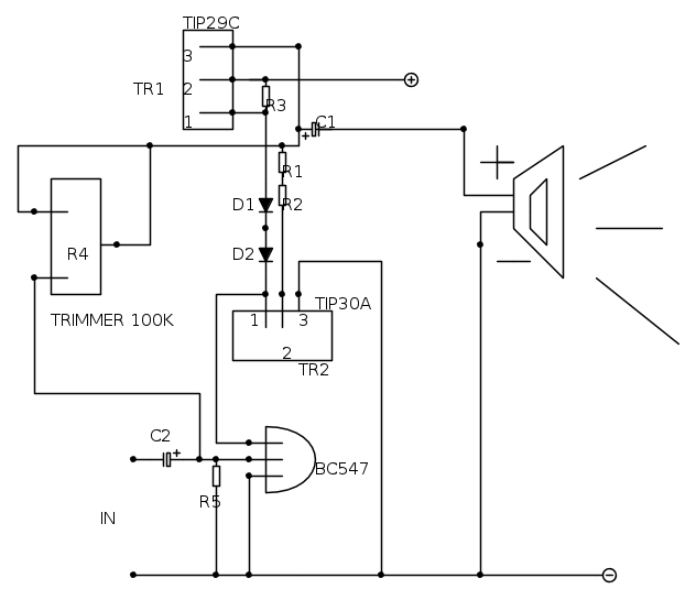 allora ho trovato questo schema online e l'ho assemblato , la corrente alla cassa arriva perché fa un rumore tipo frittura , però collegando il jack all'IN non si sente nulla l'unica cosa che ho dovuto cambiare perché non avevo è stata la resistenza da 1 kohm ne ho messa una da 1,2 kohm , poi anche il trimmer forse non l'ho collegato correttamente perché è l'unica cosa che non ho ben capito ancora , per il resto ho saldato tutto senza falsi contatti , appena ho tempo trasporto lo schema che ho assemblato su fidocad