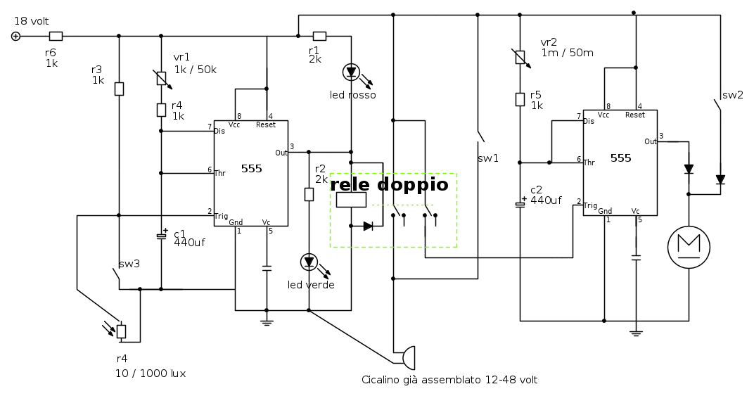 A questo punto, alla riaccensione del led rosso, dovrei far partire il 2° NE555 di destra per far ruotare il motorino per un tempo variabile ( non so ancora quanto mi servirà farlo girare). Il motorino poi tramite SW2 a piacere sara fatto girare manualmente a piacere.