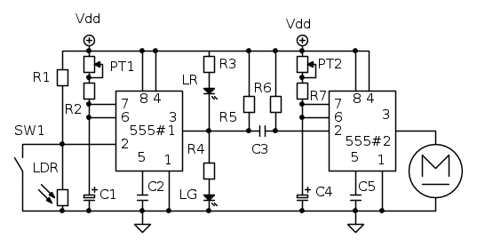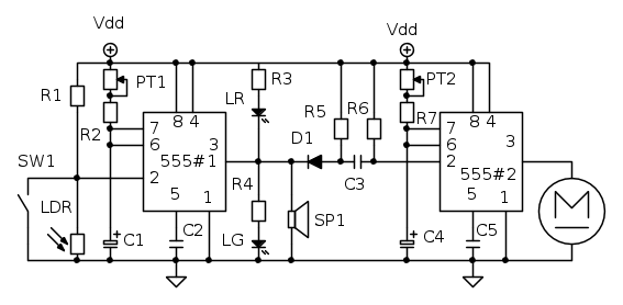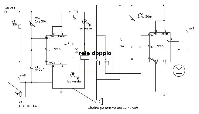 in pratica il primo ne555 di sinistra si attiva sia con R4 (sensibile alla luce) che con SW3 un pulsante normalissimo, una volta attivato spegne il led rosso e mantiene acceso il verde per un tempo variabile da VR1, passato il tempo voluto il led verde si spegne e si riaccende il led rosso costante.