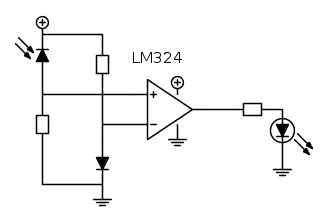 la domanda principale: senza luce che colpisce il fotodiodo nel circuito da te proposto si dovrebbe leggere metà della tensione di alimentazione??