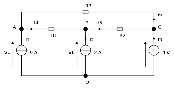 scrivo le equazioni ai nodi, considerando positive le correnti entranti e negative le correnti uscenti: