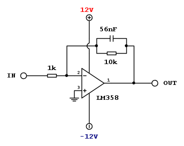 passa basso: ftH = 1/(2*π* 10*10^3Ω * 56*10^-9F) = 284Hz