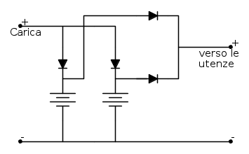 Comunque avevo scritto, tra l'altro, che è possibile mettere dei diodi di potenza per evitare l'interazione tra le batterie in parallelo, ma tali diodi hanno una caduta di tensione e potrebbero mandare in confusione il regolatore di carica che potrebbe caricarti meno le batterie ed anche l'inverter potrebbe intervenire precocemente con la protezione per bassa tensione di batteria, non sfruttando tutta la capacità delle batterie.