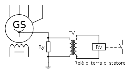 Ciò è dovuto per guasti esterni all’alternatore i quali sempre fanno circolare delle correnti capacitive nel sistema, correnti dovute sia a messa a terra in linea, sia dovute a messa a terra sull’alta tensione (trasmesse sulla bassa tensione dell’accoppiamento capacitivo degli avvolgimenti del trasformatore di potenza) : a tale scopo è stata derivata una resistenza (resistore di centro stella). Il resistore di centro stella R y limita il valore della tensione dovuta a queste correnti capacitive a un valore insufficiente a far scattare il relè.